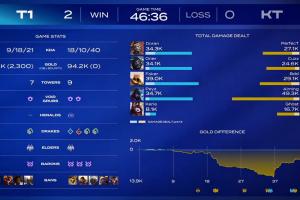 体育资讯01月23日讯 T1 2:0 KT,赛后数据面板显示T1在落后13.9k经济差的情况下最终翻盘比赛。 |